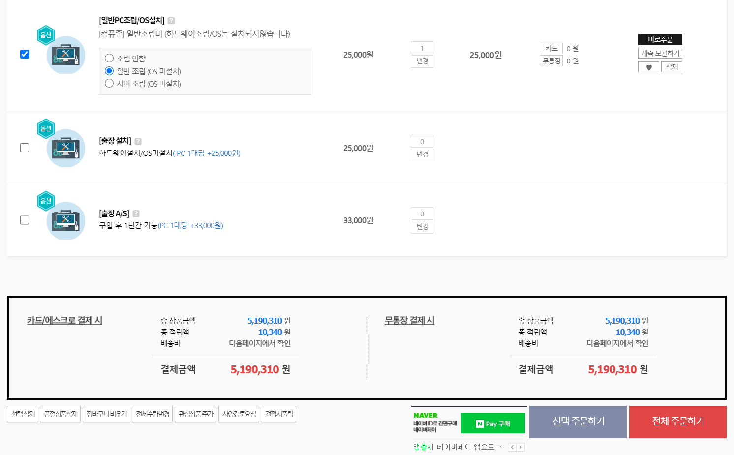 최종적으로 주문할 때는 조립과 관련한 내용을 선택할 수 있다. 필자는 다음과 같이 [일반 조립]을 선택했다.