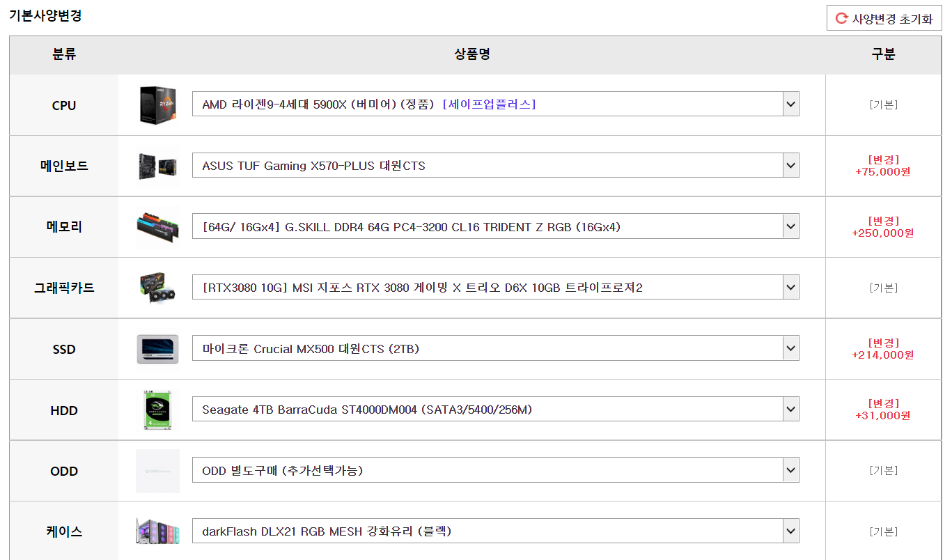 다음과 같이 상품명을 조금씩 바꾸어 보며, 기본적인 스펙을 구성해 보았다. (이는 단순히 기본 스펙만 결정한 것으로, 최종적으로는 상당수 부품을 다시 골랐다.) 참고로 이와 같이 상품을 직접 선택하여 구매하면 가격이 상당히 높게 형성될 수 있다. 그래서 필자의 경우, 이러한 제품 페이지에서 직접 구매하는 것을 추천하지는 않는다. 그래서 웬만하면 컴퓨존이나 다나와에서 부품을 개별적으로 검색하여 최종적인 최저가를 찾은 뒤에, 해당 최저 가격으로 구매하는 것이 좋다.
