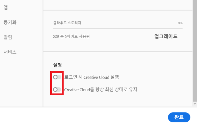 이후에 다음과 같이 [로그인 시 Creative Cloud 실행]과 [Creative Cloud를 항상 최신 상태로 유지]를 꺼줍니다.