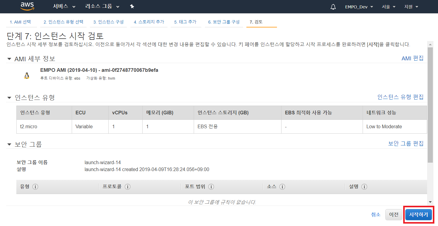 이제 원하는 인스턴스 유형으로 [검토 및 시작] 하시면 됩니다.