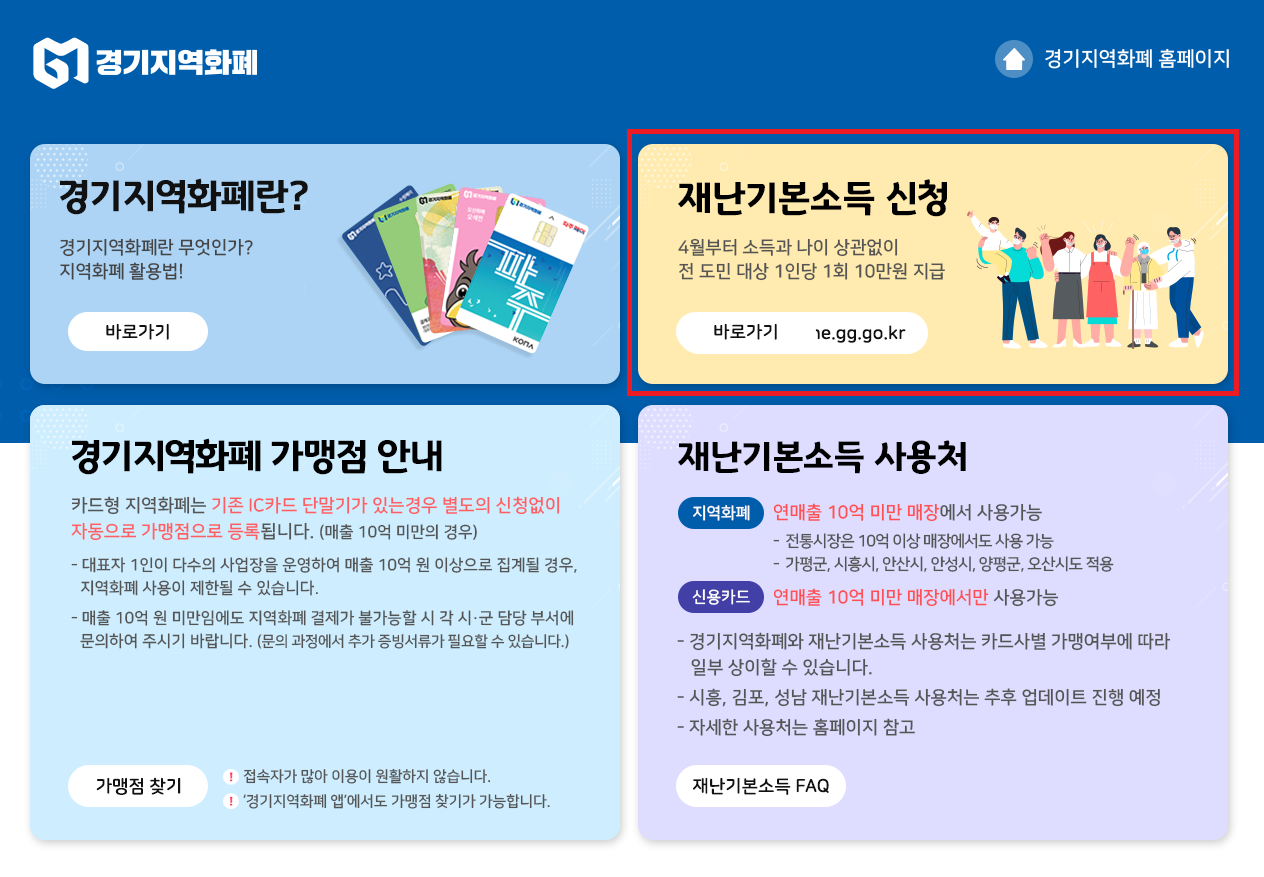 최근 코로나19(COVID-19)로 인하여 국가적인 재난 상황입니다. 그래서 경기도에서는 2020년 4월부터 7월까지 경기도민들에게 경기도 재난기본소득을 달마다 지급합니다. 신청은 경기지역화폐 사이트에서 진행할 수 있습니다.