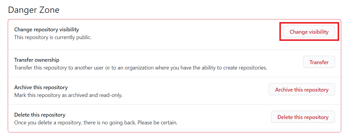 [Settings] 탭에서 아래로 쭉 내려 보시면 다음과 같이 [Danger Zone]에 [Change Visibility] 버튼이 있습니다. 이를 클릭해서 해당 저장소가 외부에 보일지 안 보일지를 설정할 수 있습니다.