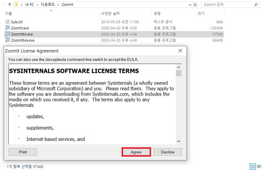 다운로드 이후에는 별도의 설치 과정 없이 윈도우 응용 프로그램 형태로 바로 실행하실 수 있습니다. 윈도우 64비트 운영체제를 기준으로 ZoomIt64.exe를 실행하시면 처음 실행했을 때는 라이센스 동의 안내 문구가 등장합니다.