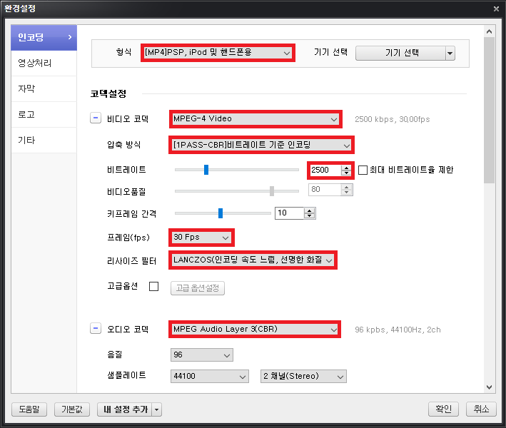일반적으로 용량이 적으면서 보편적으로 사용되는 MP4 형식을 선택한 뒤에, 비디오 코덱으로는 기본 MPEG-4 Video를 선택하자. 그리고 압축 방식을 고정 비트율(CBR, Constant Bit Rate)으로 설정한다. 나는 강의 영상을 위해 2,500Kbps를 이용(원본 영상과 동일하도록)한다. 또한 리사이즈 필터로는 화질 보존을 위하여 LANCZOS를 이용하는 것이 일반적이다. 참고로 비트레이트 설정에 유의해야 한다. 일반적으로 오디오 싱크가 밀리는 경우에는 화질은 유지하고 싶은 경우가 많기 때문에, 비트레이트는 기존 영상과 동일하게 맞춰 주는 것이 좋다.