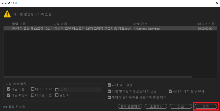 이미 영상을 거의 다 편집했는데 이러한 문제를 발견했다면 어떻게 대처할 수 있을지 고민해보았다. 필자가 한 가지 실험해 본 내용으로는 기존 영상 편집에 사용되었던 동영상을 삭제하고 CBR로 재인코딩된 이미지를 사용해보자는 아이디어였다. 필자는 동영상 자르기 위주의 편집을 진행하므로, 실제로 편집 기록은 그대로 남아있고 동영상만 바뀔 것을 기대할 수 있다. 실제로 영상 편집에 사용되었던 원본 동영상을 삭제하면 다음과 같이 미디어를 찾을 수 없다는 메시지가 출력된다. 여기에서 [찾기] 버튼을 눌러서 재인코딩된 이미지를 선택해보자.