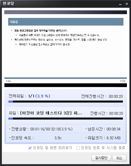 이어서 [인코딩 시작] 버튼을 눌러서 인코딩을 진행하자. 일반적으로 인코딩 속도는 3배~6배 정도가 나온다.