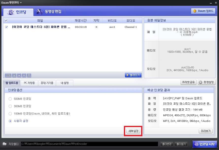 다음 팟 인코더를 실행한 뒤에 프리미어 프로에서 편집하고자 하는 동영상을 불러오자. 이후에 [세부설정] 탭으로 들어가서 인코딩 설정을 진행한다.