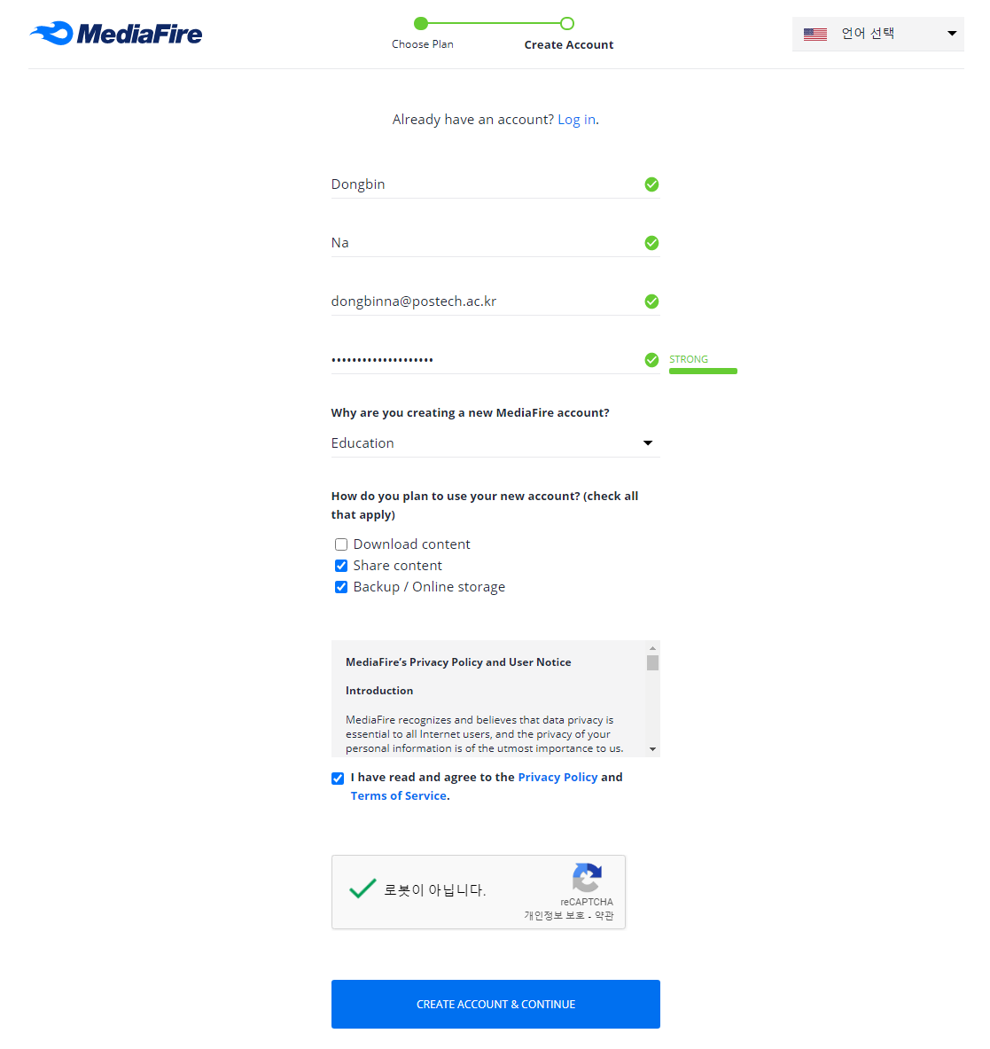 이후에 다음과 같이 회원가입을 진행한다. 참고로 2020년 11월을 기준으로 별도로 이메일 인증은 존재하지 않는다.