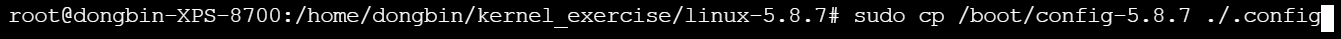 커널 디렉터리 내부에 들어온 뒤에는 가장 먼저 .config 파일을 생성해야 한다. 이는 커널 환경설정 파일이다. 이때 간단히 현재 자신의 커널 설정을 그대로 옮겨올 수 있다. 만약 컴파일을 진행하는 컴퓨터의 커널 설정을 그대로 적용하고자 한다면 마음과 같은 형태의 코드를 사용한다.