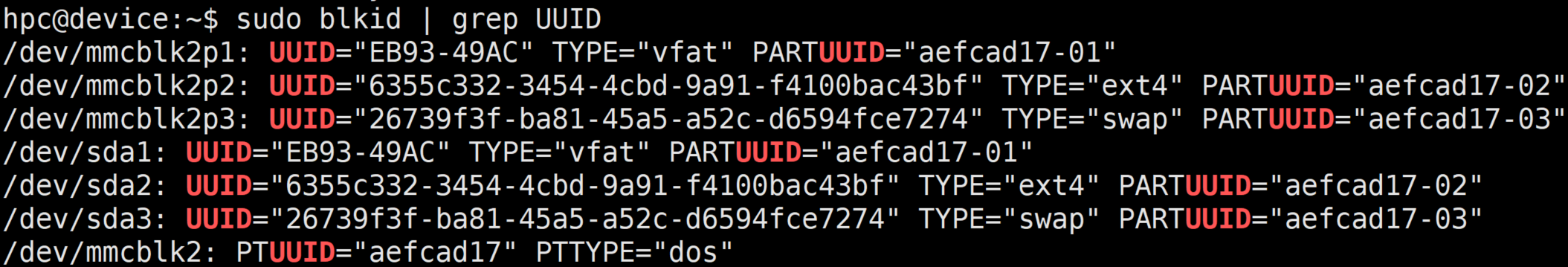 이러한 문제를 해결하기 위해 하나의 디스크의 UUID를 변경하는 시도를 해보자. 그러기 전에 가장 먼저 blkid 명령어를 이용하여 UUID를 포함한 구체적인 저장장치 정보를 확인할 수 있다. (sudo blkid | grep UUID) 확인해 보면 sda와 mmcblk2p의 UUID가 정확히 동일한 것을 알 수 있다. 이러한 상황에서는 문제가 발생할 수 있는 것이다.