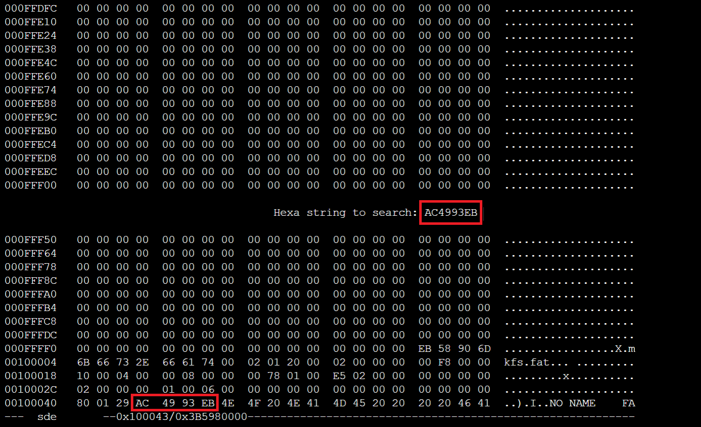 그래도 아직 UEFI 관련 파티션의 UUID는 변경되지 않았다. 그래서 UEFI 파티션의 UUID를 바꾸기 위한 방법을 생각해 보다가 HEX 데이터를 변경하여 수정하는 방법을 진행해 보았다. UUID 값이 "EB93-49AC"라고 되어 있으므로, /를 눌러 "AC4993EB"를 검색했다.
