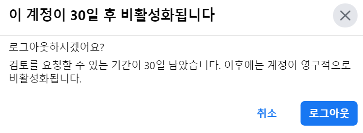 또한 로그아웃을 하려고 했더니, 다음과 같이 계정이 30일 후 비활성화된다는 공포의 메시지가 등장했습니다. 필자는 어떠한 잘못도 하지 않았는데, 계정이 영구적으로 비활성화된다면 억울할 것 같습니다.