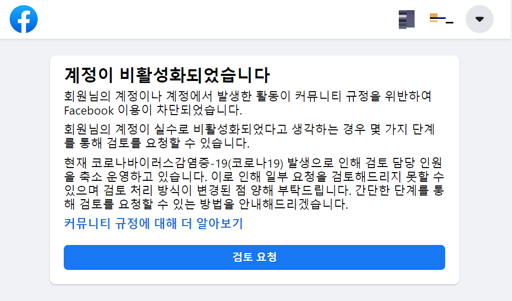 하지만 필자의 경우 가명을 사용하고 있지도 않고, 약관을 위반하는 게시물을 작성한 적도 없습니다. 또한 오직 하나의 페이스북 계정만 사용하고 있습니다. 가끔 운동하는 영상을 올리긴 했는데, 정책을 위반한 적은 한 번도 없습니다. 아무튼 계정이 비활성화되고, 본인이 생각하기에 비활성화 처리 될 이유가 없다는 생각이 들면 [검토 요청]을 진행할 수 있습니다.