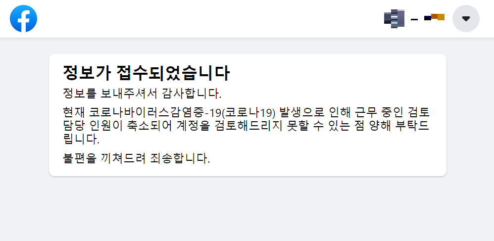 필자의 경우 사진을 찍어 업로드했습니다. 그랬더니 다음과 같이 정보가 접수되었다는 메시지를 확인할 수 있었습니다. 현재는 코로나19 바이러스로 인해 계정을 정상적으로 검토하지 못할 수도 있다고 합니다.