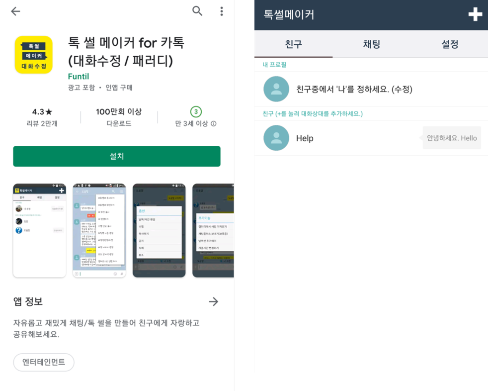 간혹 연기 콘텐츠를 만들거나, 영상 콘텐츠를 만들 때는 가짜 카카오톡 대화를 만들어야 할 필요가 있다. 다음과 같이 "톡 썰 메이커"를 검색하여 [설치]를 진행한다. 설치 이후에는 다음과 같은 화면이 나온다.