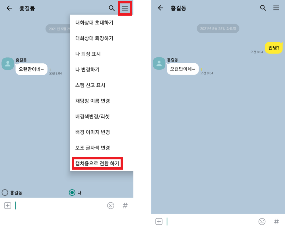 참고로 만들어진 가짜 카톡 대화방을 공유할 때는 아래쪽에 존재하는 광고를 없애고 싶을 것이다. 이때는 다음과 같이 햄버거 버튼을 누른 뒤에 [캡처용으로 전환하기] 버튼을 누른다. 그러면 아래쪽에 표시되는 광고가 제거되므로, 캡처했을 때 일반적인 카카오톡 대화방처럼 보이게 된다.