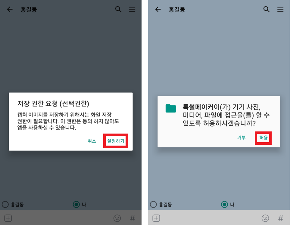 처음 대화방에 접속하면 [저장 권한 요청] 창이 뜨는 것을 확인할 수 있다. 대화방 캡처 이미지를 저장하기 위해 권한이 필요하다는 것이다. 필자는 다음과 같이 파일 접근 권한에 [허용] 버튼을 눌렀다.