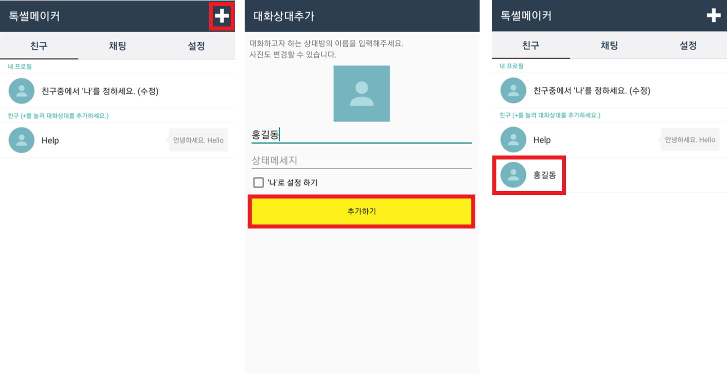 가짜 대화를 만들기 위해 가장 먼저 [대화 상대 추가]를 진행한다. 이때 원하는 프로필을 생성하여 [추가하기]를 누른다. 예를 들어 "홍길동" 계정을 만들기 위해서는 다음과 같이 하면 된다.