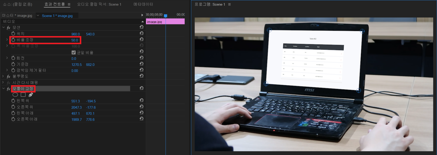 이후에 다음과 같이 [비율]을 조금 변경한 뒤에 [모퉁이 고정]을 눌러서 화면에 맞게 이미지나 동영상을 넣으면 된다.