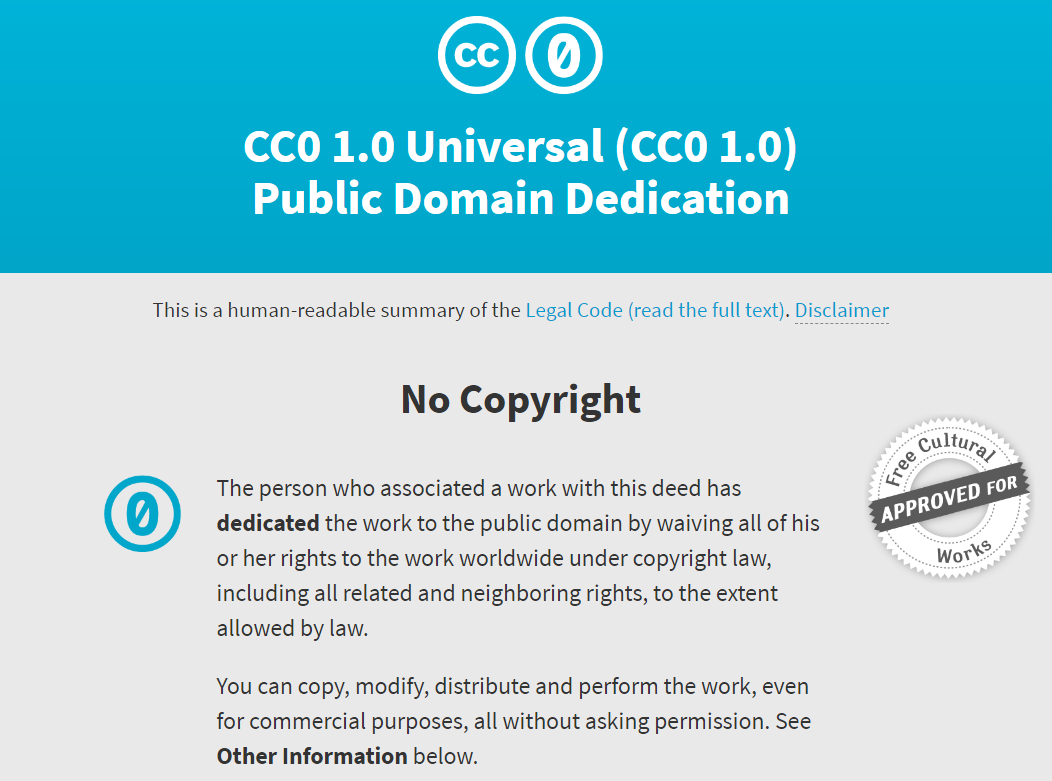 확인 결과 마스크 데이터셋은 CC0 라이센스가 붙은 것을 알 수 있습니다. CC0 라이센스는 기본적으로 아무런 조건없이 사용할 수 있는 공개된 저작권을 의미합니다. 상업적인 목적을 포함한 어떠한 목적으로든 해당 저작물을 이용할 수 있다는 점이 특징입니다. 자세한 설명은 아래 내용을 확인하세요. "No Copyright"이라고 적혀있는 것을 확인할 수 있습니다.