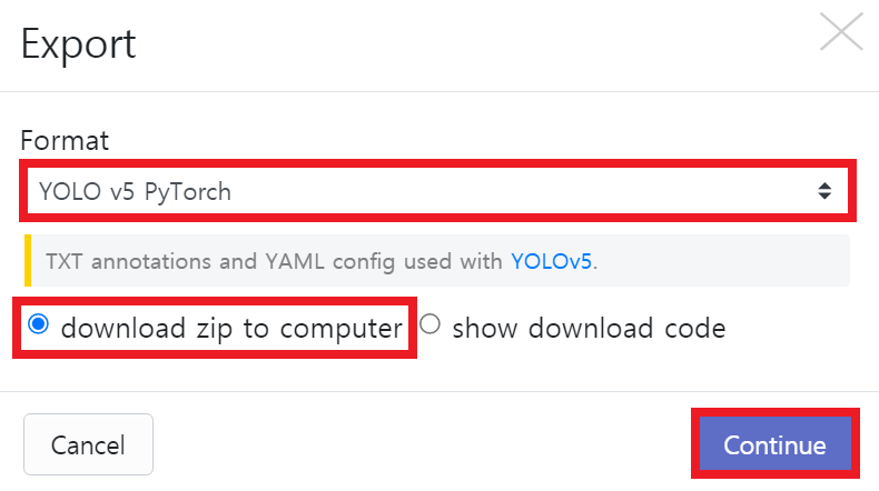 다운로드를 할 때는 자신이 원하는 형식(format)으로 다운로드를 진행할 수 있습니다. 대표적으로 YOLO v5 PyTorch 버전의 형식을 다운로드할 수 있습니다.