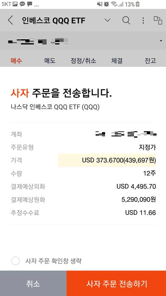 이후에 다음과 같이 주문 내역을 자세히 확인한 뒤에 [사자 주문 전송하기] 버튼을 눌러 구매를 진행할 수 있다. 나중에 자신이 구매한 해외 주식을 확인하고 싶을 때는 [잔고] 페이지로 이동한 뒤에 [해외] - [체결잔고] 탭으로 들어가면 된다.