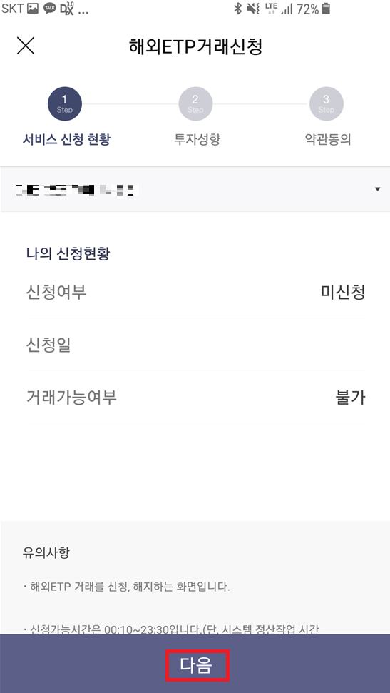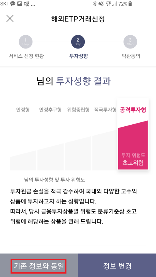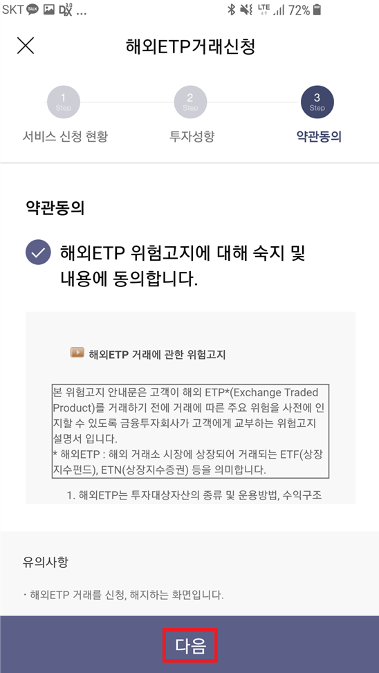 이후에 다음과 같이 마찬가지로 [해외ETP거래신청] 탭에서도 투자성향을 확인하고, 약관에 동의한 뒤에 신청을 완료하면 된다. 단순히 요구하는 대로 [확인]만 진행하면 큰 어려움 없이 신청 가능하다.