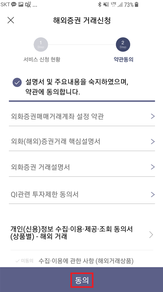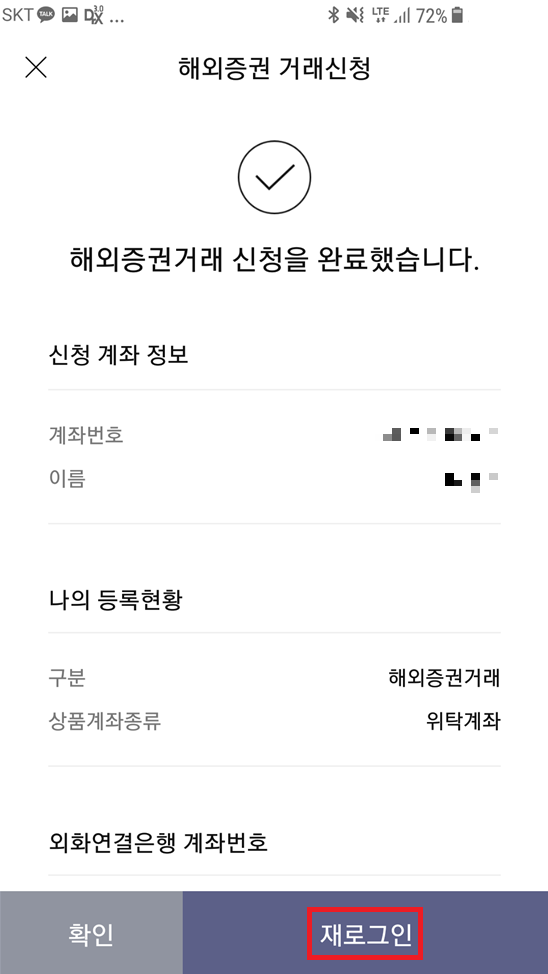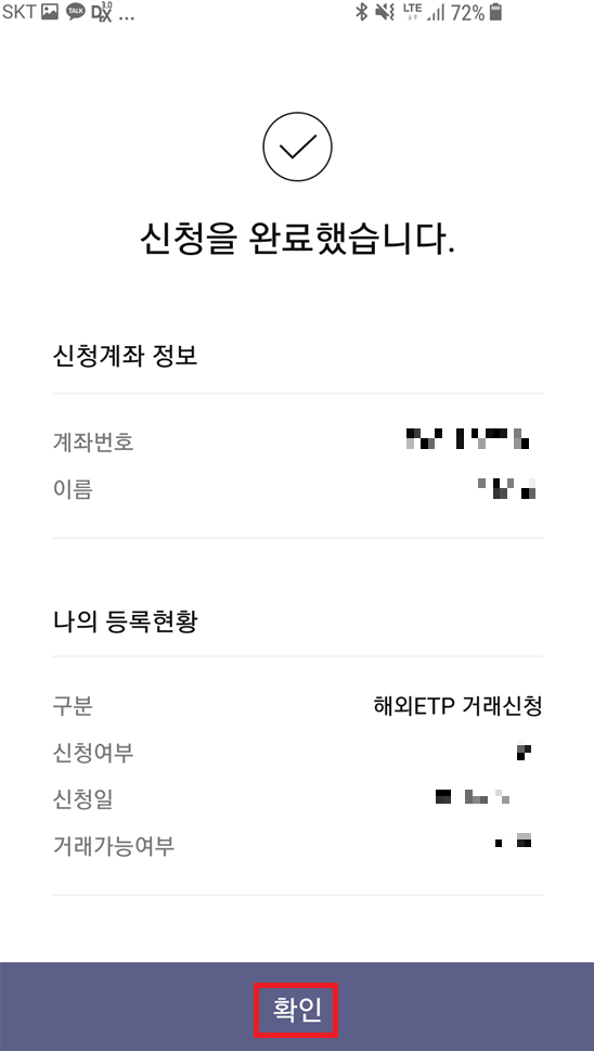 결과적으로 모든 약관을 잘 읽어 본 뒤에 [동의]하고, [거래 신청]을 완료하면 된다. 최종적으로 다음과 같이 해외증권 거래 신청이 완료되는 것을 확인할 수 있다.