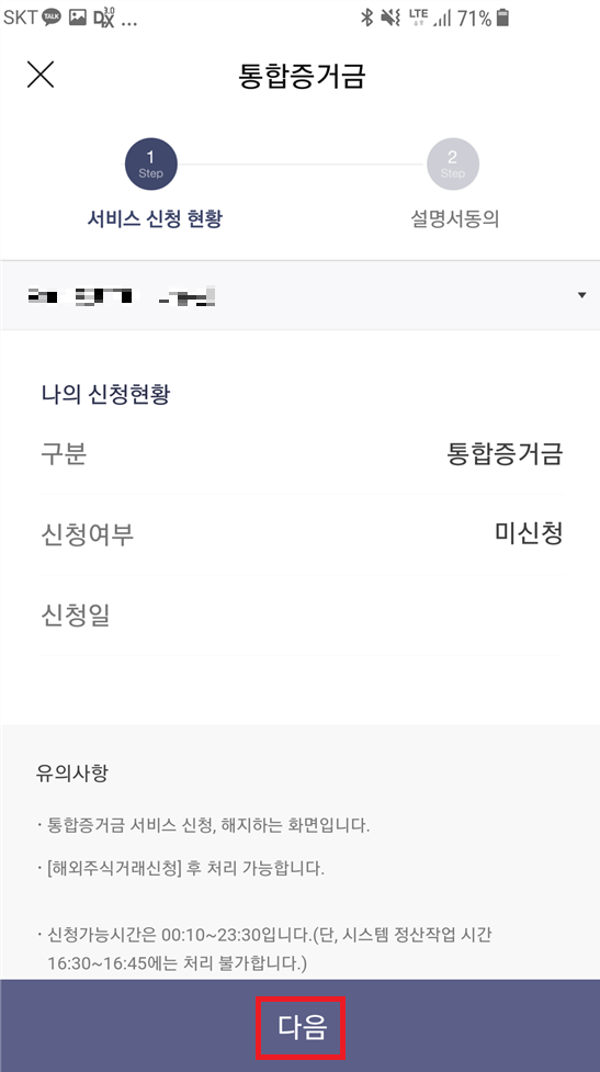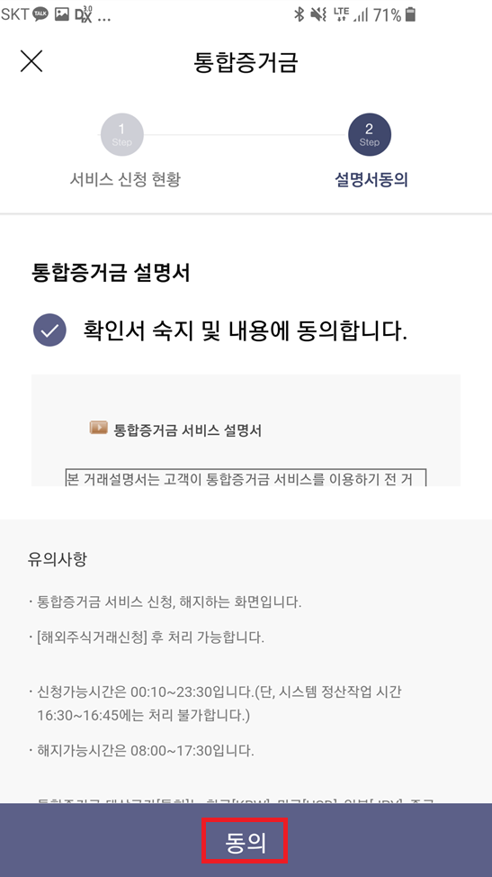 이후에 마찬가지로 통합증거금 신청에 대하여 설명서를 확인하고 [동의] 버튼을 누르면 된다.