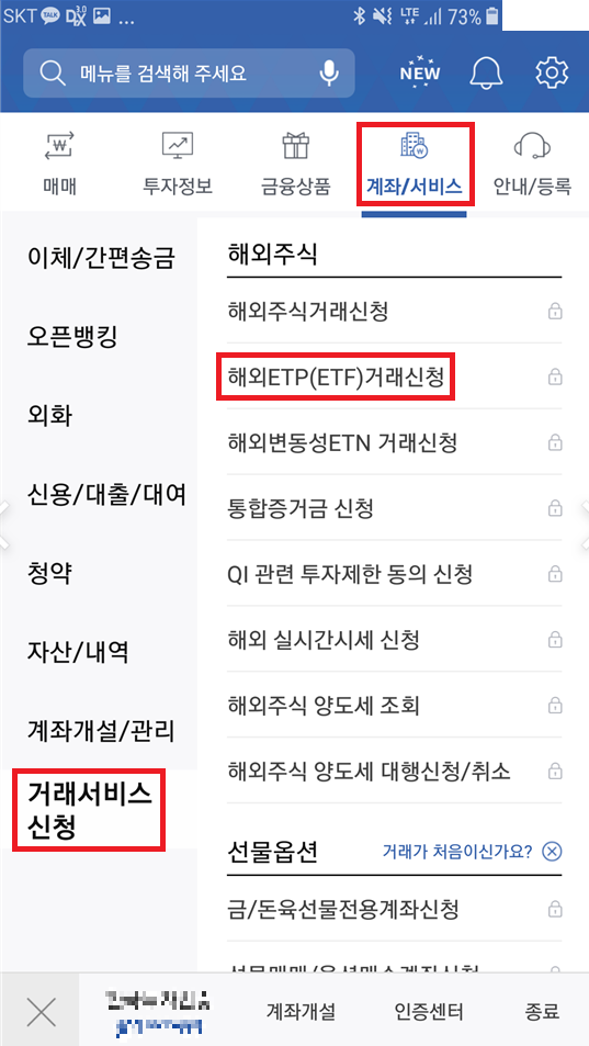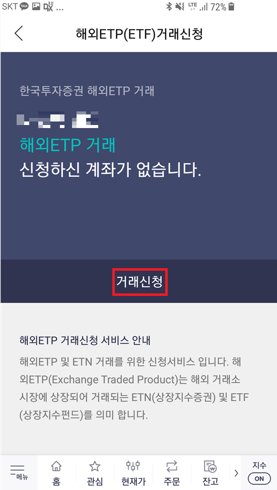 또한 S&P 500과 같은 ETF에도 투자하고 싶다면, 해외 ETP(ETF) 거래 항목 또한 신청할 필요가 있다. 한국투자증권 앱을 실행한 뒤에 [메뉴] - [계좌/서비스] - [거래서비스신청] - [해외ETP(ETF)거래신청]을 눌러 신청을 진행한다.