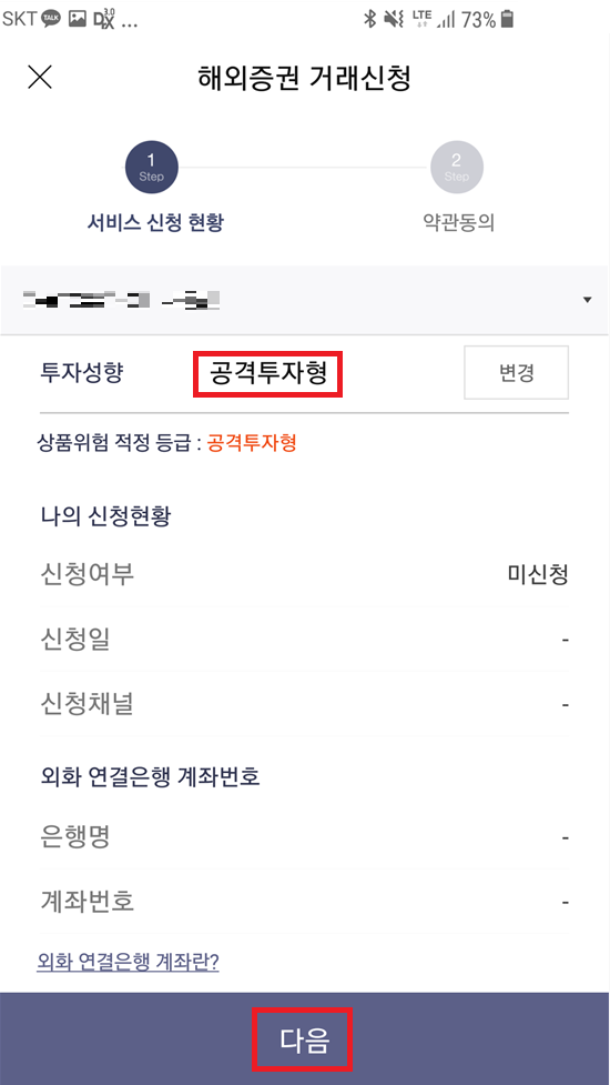 한국투자증권 앱을 실행한 뒤에 [메뉴] - [계좌/서비스] - [거래서비스신청] - [해외주식거래신청]을 눌러 신청한다. 다음과 같이 [거래신청] 버튼을 누른다. 기본적으로 한국투자증권은 기존에 가지고 있던 계좌를 이용해 해외 주식도 구매할 수 있도록 해주므로, 매우 편리하다. 또한 해외증권 거래신청을 할 때는 [투자성향]을 확인한 뒤에 신청해야 한다. 만약 본인의 투자 성향에 대해 작성하지 않았다면, 투자 성향을 체크하는 절차를 거쳐야 한다.