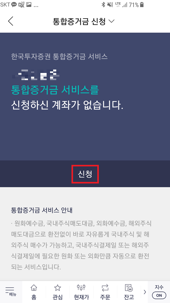 또한 한국투자증권에서는 통합증거금을 신청할 수 있다. 통합증거금 서비스를 이용하면, 가지고 있는 원화로 바로 거래가 가능하기 때문에 편리하다. 다시 말해 내가 직접 환전하지 않아도 자동환전되기 때문에 편리한 것이다.