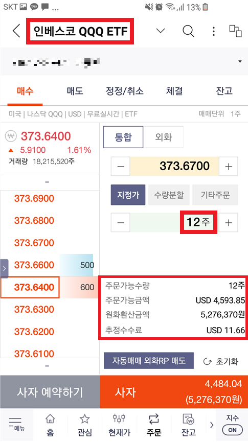 필자가 실제로 구매를 해보았는데, 과정은 매우 간단했다. [주문] - [검색]으로 들어간 뒤에, [해외주식] 탭을 선택하고,자신이 원하는 외국 회사 이름을 검색한다. 필자는 QQQ를 검색했다. 검색 이후에는 구매할 주식 개수를 검색한 뒤에 [사자] 버튼을 누르고 구매하면 된다.