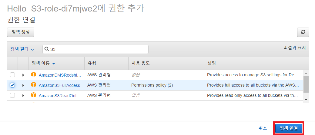 이후에 새로운 정책으로 AmazonS3FullAccess를 추가합니다.