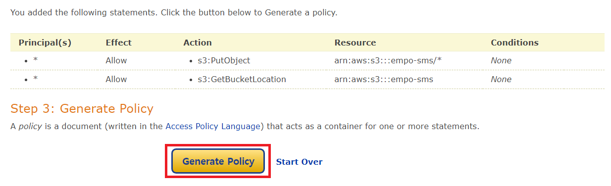 그리고 [Generate Policy] 버튼을 눌러서 정책 명령어를 생성할 수 있습니다.