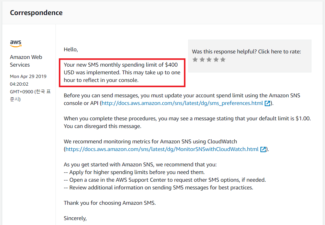 아무튼 AWS SMS 지출 한도 승인을 완료되었을 때는 다음과 같이 AWS에서 연락이 옵니다. (저는 400달러로 한도를 설정했습니다.)