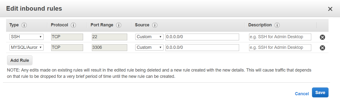 2. 보안 그룹 설정을 진행합니다. [인바운드] - [편집] - [규칙 추가] - [MySQL/Aurora] - 허용 IP로 [0.0.0.0/0]를 설정합니다.