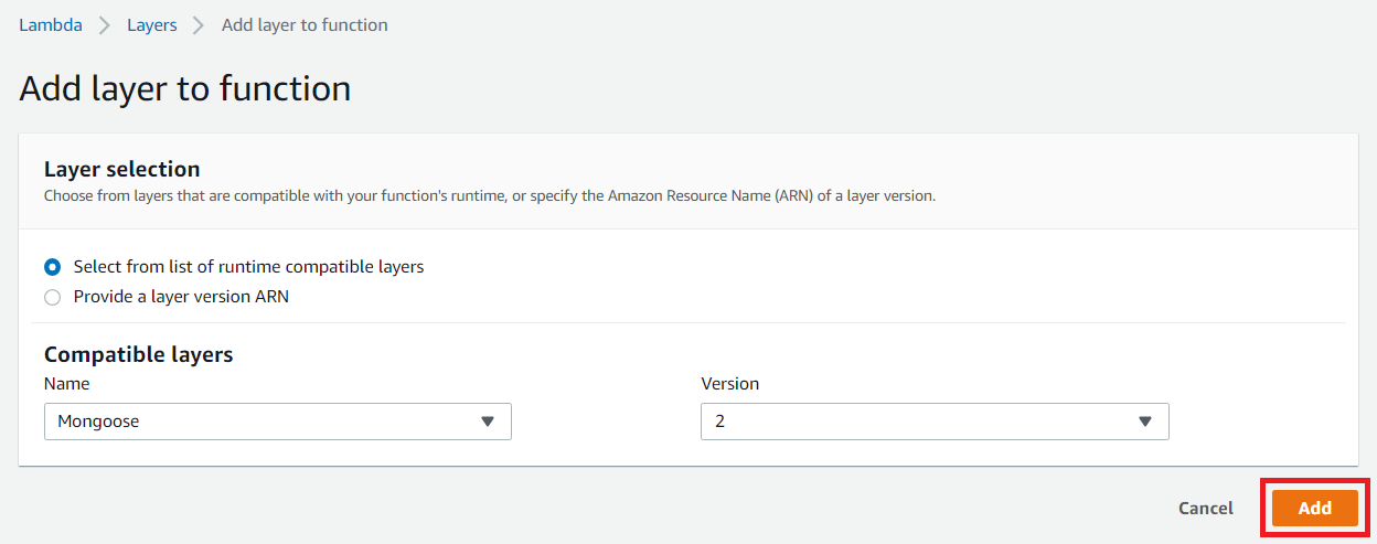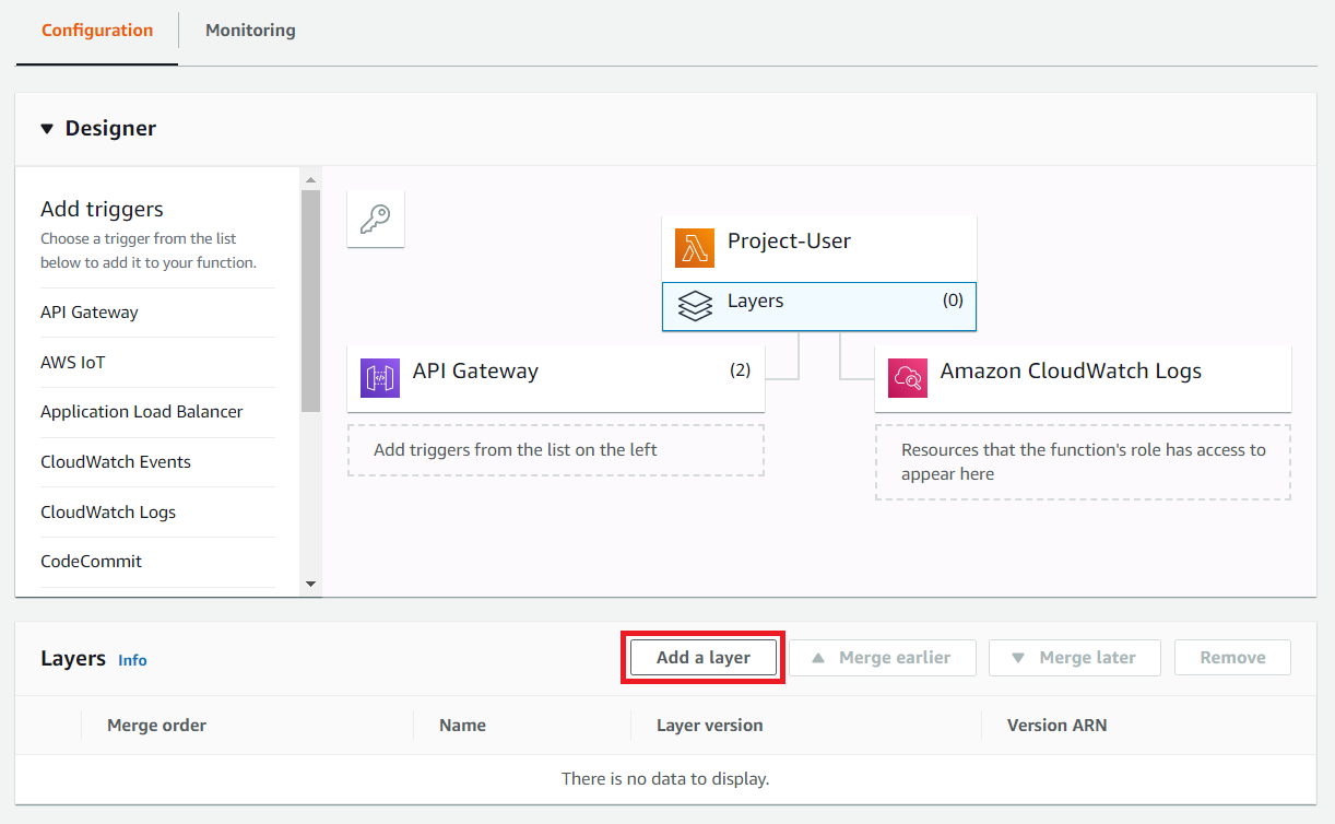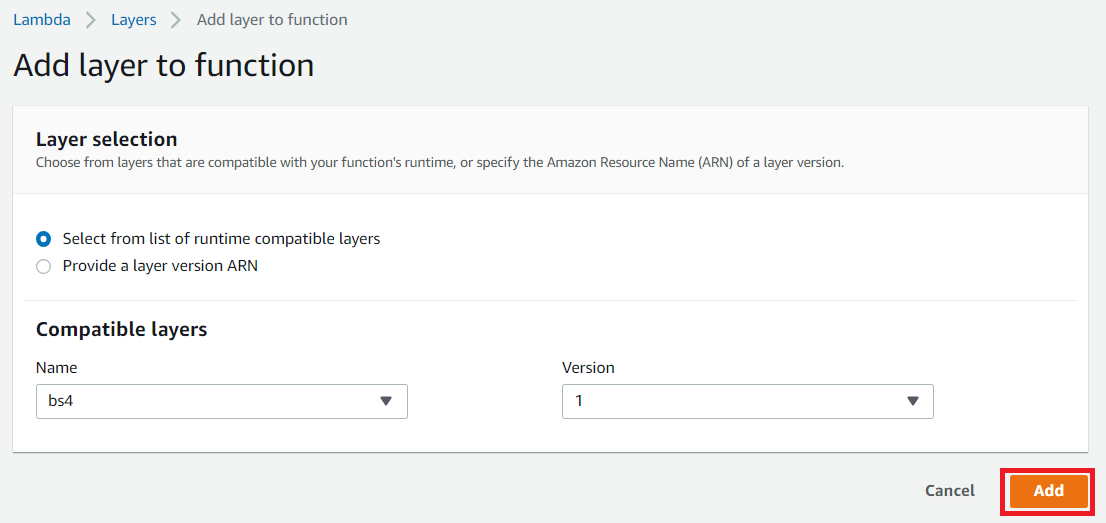 이제 람다 함수의 Layer로, 방금 생성한 Layer를 넣습니다.