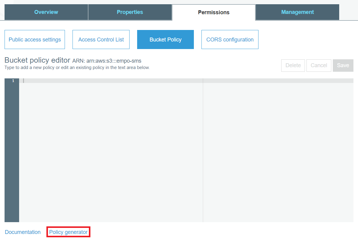 다만 이 경우 AWS SNS가 해당 버킷(Bucket)에 쓰기 권한이 있어야 하기 때문에, 간단히 S3의 [Bucket Policy]를 설정해보도록 하겠습니다. [Policy Generator]를 눌러서 정책을 생성합니다.