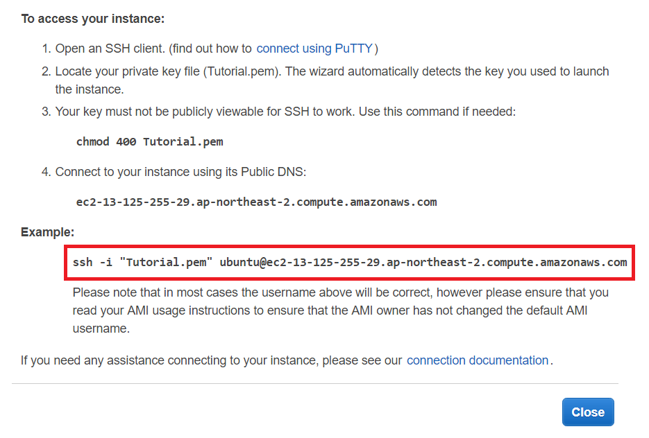 이제 다음과 같이 SSH로 AWS EC2 서버에 접속해보겠습니다.