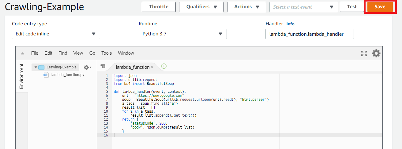 이제 Lambda Function의 코드를 다음과 같이 바꿉니다. bs4라는 라이브러리를 이용해서 크롤링을 수행합니다.