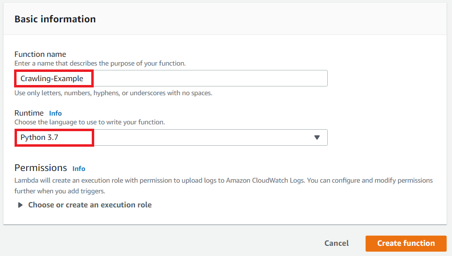 실습을 위해 하나의 Lambda Function을 생성합니다. 예제 코드는 Python으로 작성하겠습니다. 예제 함수에서는 간단한 크롤링 프로그램을 구현할 것입니다. 크롤링을 위해서는 b4라는 라이브러리가 필요합니다.