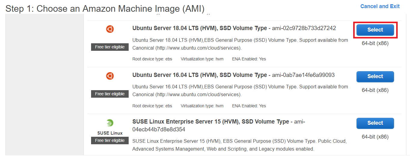 2. [인스턴스 시작] 버튼을 눌러 [Ubuntu Server 18.04 LTS (HVM), SSD Volume Type]로 인스턴스를 생성합니다.