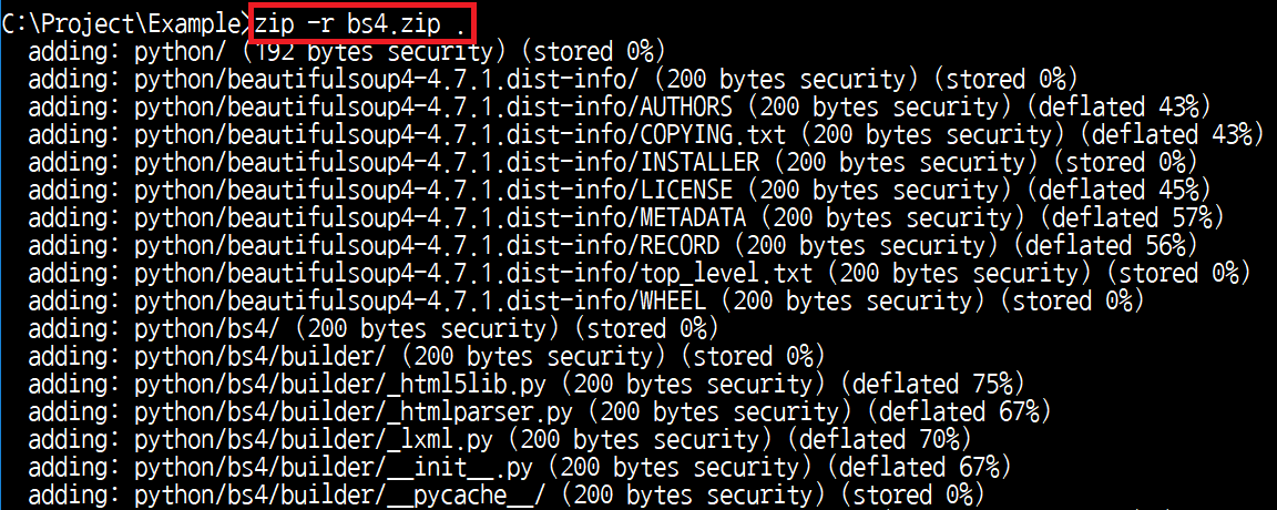 이후에 이 python 폴더를 포함하는 폴더를 압축합니다. 다시 말해, 압축 파일의 상위 폴더가 python이 되어야 합니다. 저는 다음과 같이 bs4.zip라는 이름의 압축 파일로 압축했습니다.