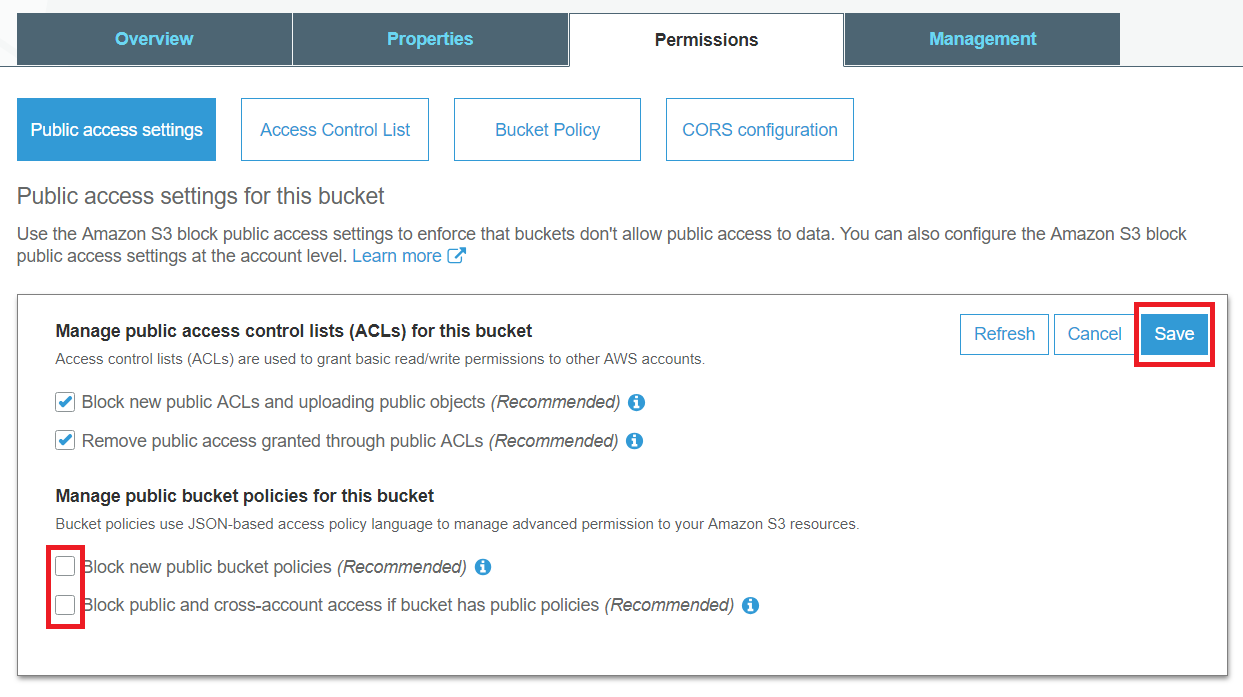 이제 다시 AWS S3의 [Permissions] 탭에서 버킷 정책(Bucket Policy)을 바꿀 수 있도록 설정합니다.