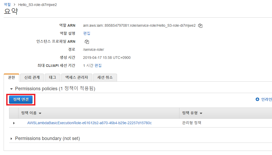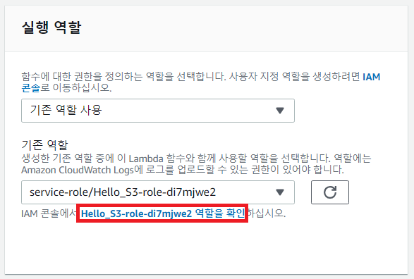 다만, 지금 바로 실행하면 S3에 접근할 수 없어서 오류가 발생할 수 있습니다. AWS Lambda가 S3에 접근할 수 있는 권한이 있는지 확인해야 합니다. 따라서 [실행 역할]에서 IAM 계정 정보를 확인합니다.
