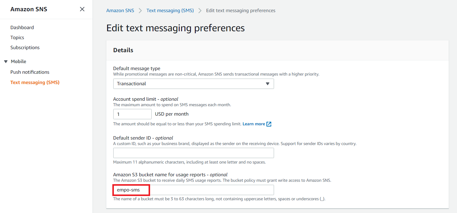 이후에 [Edit Text Messaging Preferences] 탭에서 해당 AWS S3 버킷을 Report 전송용으로 설정하면 됩니다. 그러면 매일매일의 SMS 사용량 Report가 S3에 전송된다는 특징이 있습니다.