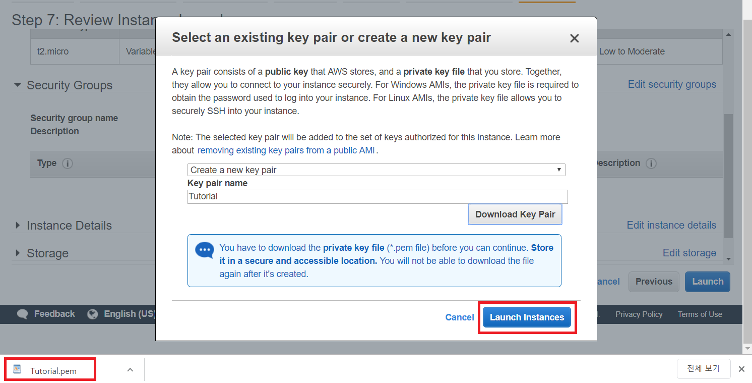 4. 키 페어를 생성해 저장한 뒤에 [인스턴스 시작] 버튼을 누릅니다.