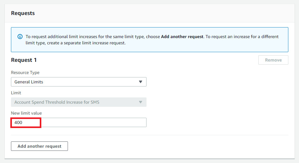 이후에 [General Limits]를 선택한 뒤에 한계 값(Limit Value)을 설정할 수 있습니다. 일반적으로 이 값은 늘리고자 하는 수치를 의미합니다. 저는 AWS SMS를 한 달에 400 달러까지 사용할 수 있다고 적은 것입니다.