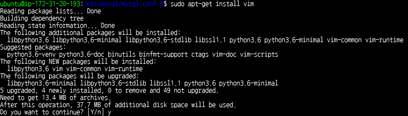 (이 때 만약 vi가 설치되어 있지 않다면 다음과 같이 vim을 설치합니다.)